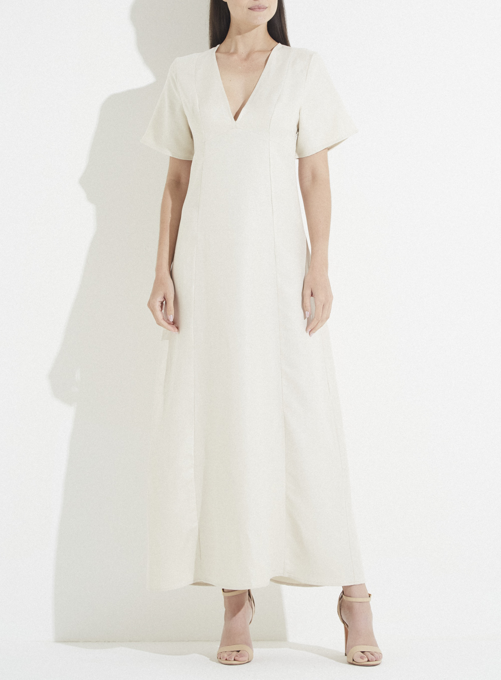 Blusa apresenta modelagem reta, decote em V, manga curta, comprimento longo e barra inferior com acabamento simples.